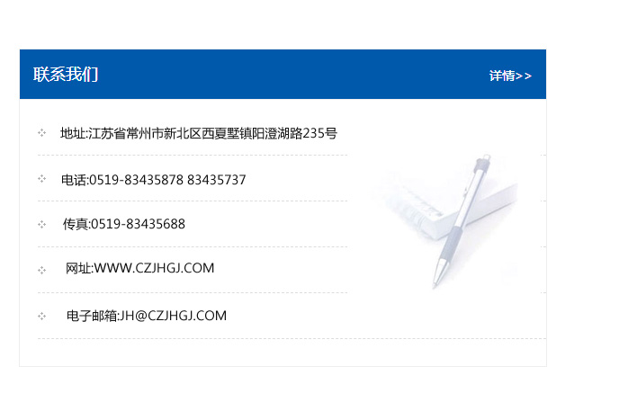 地址:常州市新北區友邦商務大廈1幢16、17層  電話:0519-85101652  傳真:0519-85112595  郵編:213022  網址:www.cz-jiayue_cn.mm1312.com  郵箱:xiajifengaa@163.com